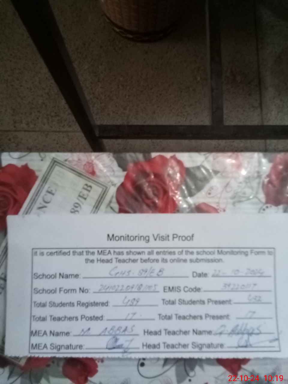 | Certified that this School was Inspected by the Undersigned MEA/DMO Today and the Information Stated Above is as Per Record. | |||||