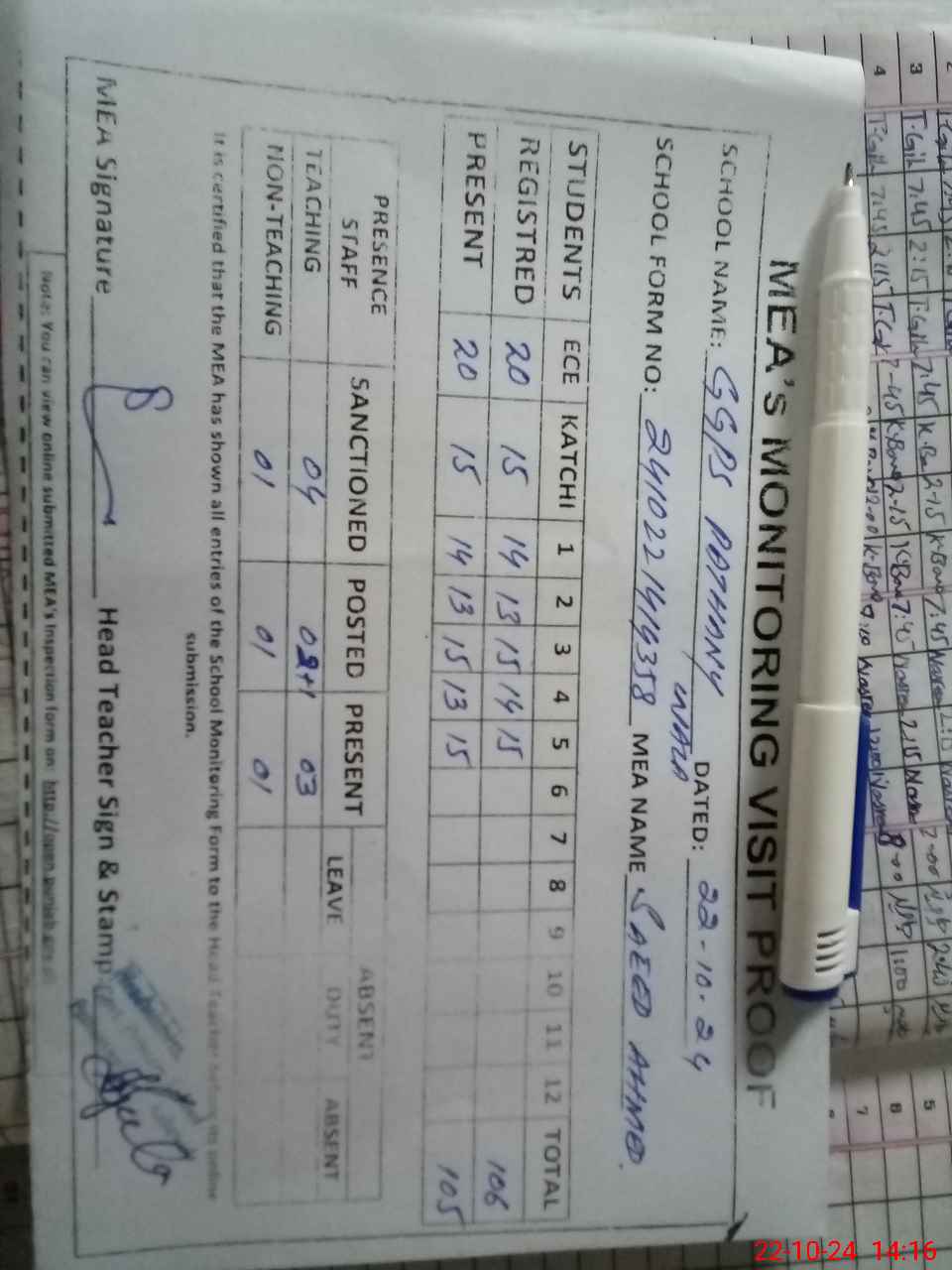 | Attendance Register | Head Teacher | MEA with School | Visit Proof |