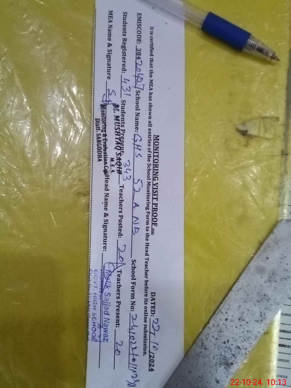 | Certified that this School was Inspected by the Undersigned MEA/DMO Today and the Information Stated Above is as Per Record. | |||||