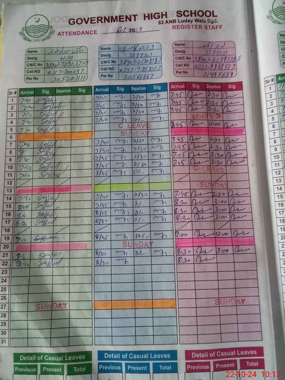 | CNIC | Full Name | Designation | R/C | Absence during last cal. month |
