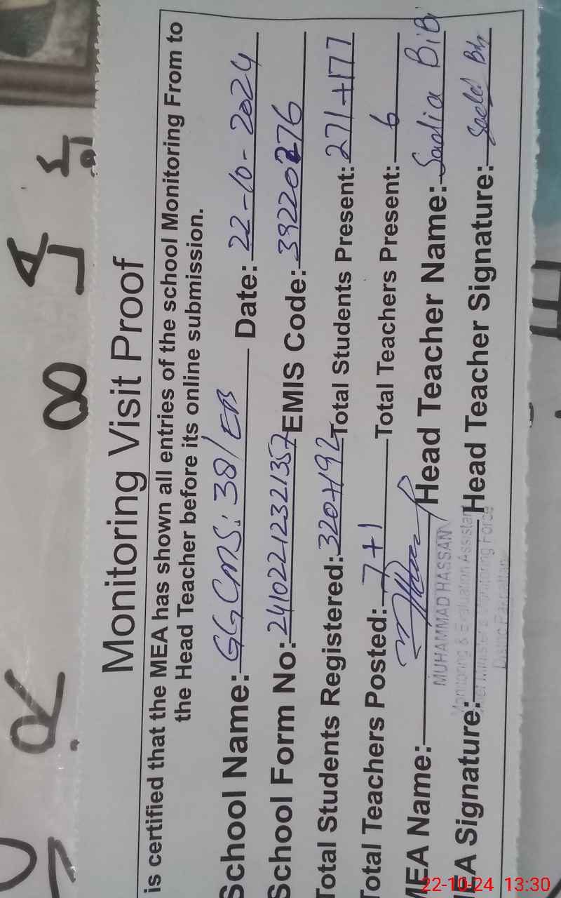 | Certified that this School was Inspected by the Undersigned MEA/DMO Today and the Information Stated Above is as Per Record. | |||||