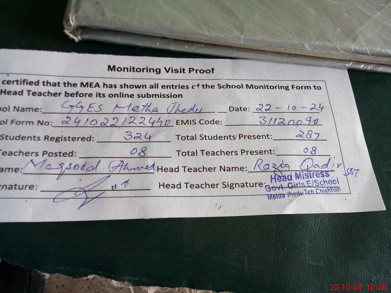 | EMIS Code: 31120090 | Name of School: GGES METHA JHEDU | |||