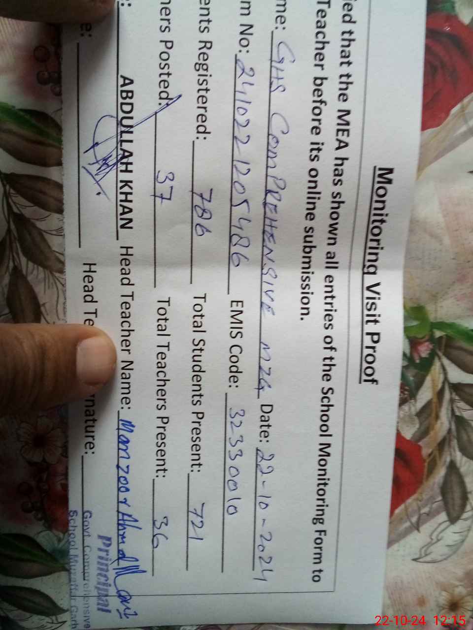 | Name: MA**** HA**** Designation: (School Headmaster's/Headmistress's) PRINCIPAL Phone/Cell Number: 03**** |
