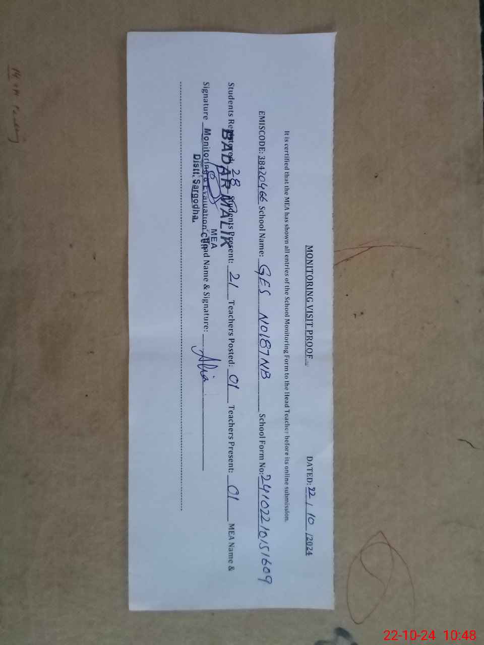 | Certified that this School was Inspected by the Undersigned MEA/DMO Today and the Information Stated Above is as Per Record. | |||||
