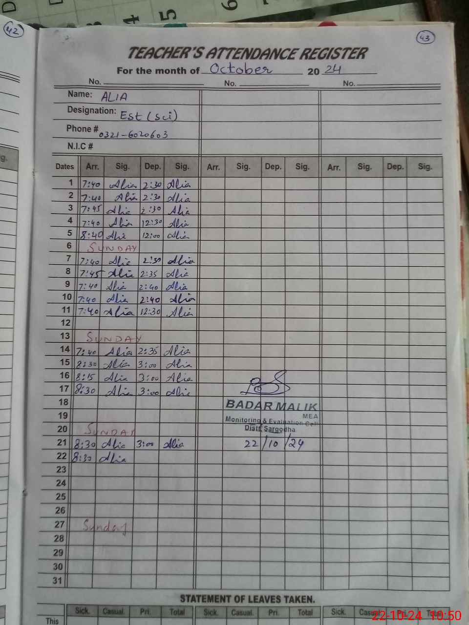 | Name: AL**** Designation: (School Headmaster's/Headmistress's) EST (GENERAL) Phone/Cell Number: 03**** |