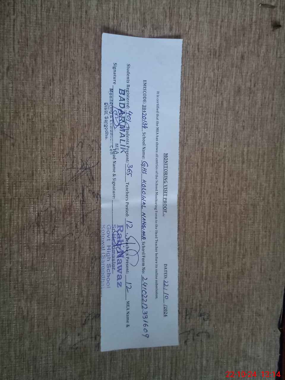 | Certified that this School was Inspected by the Undersigned MEA/DMO Today and the Information Stated Above is as Per Record. | |||||
