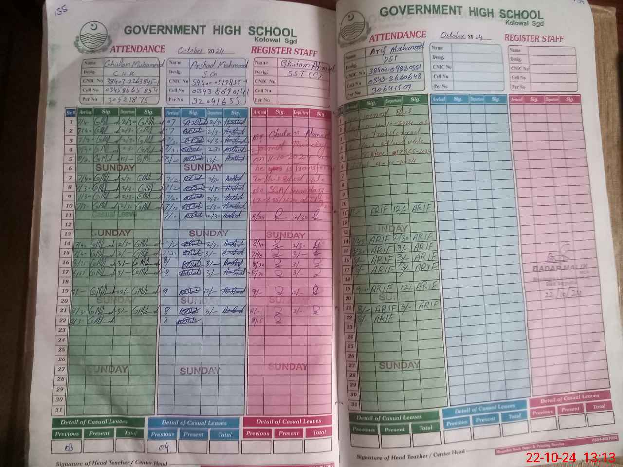 | CNIC | Full Name | Designation | R/C | Absence during last cal. month |