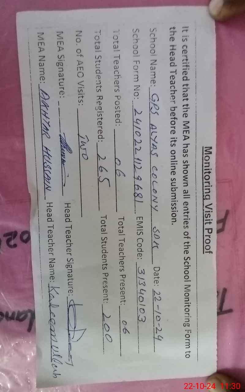 | EMIS Code: 31340103 | Name of School: GPS ALYAS COLONY | |||