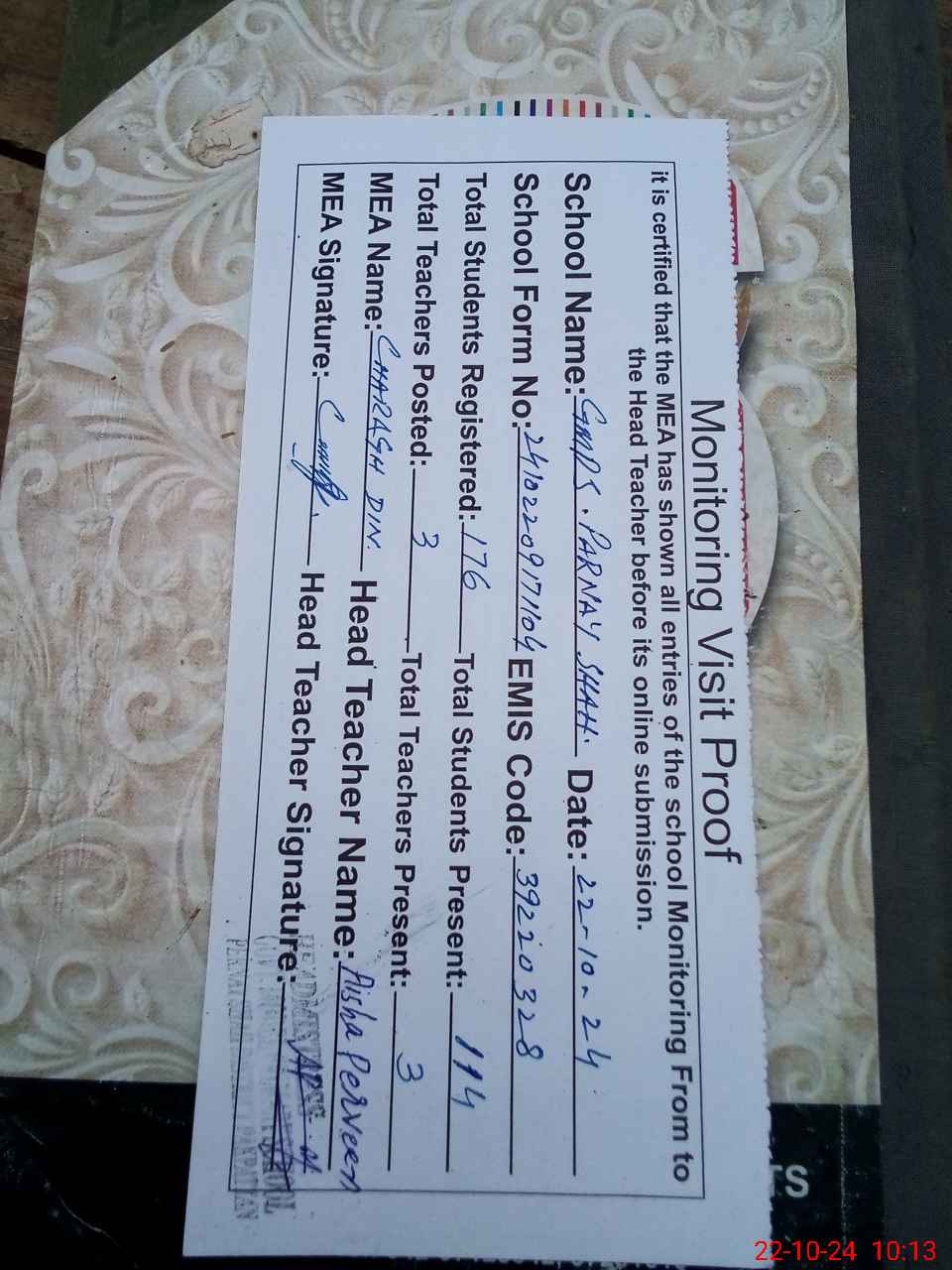 | EMIS Code: 39220328 | Name of School: GMPS PARNAY SHAH PO NOORA RATH ARIF WALA | |||