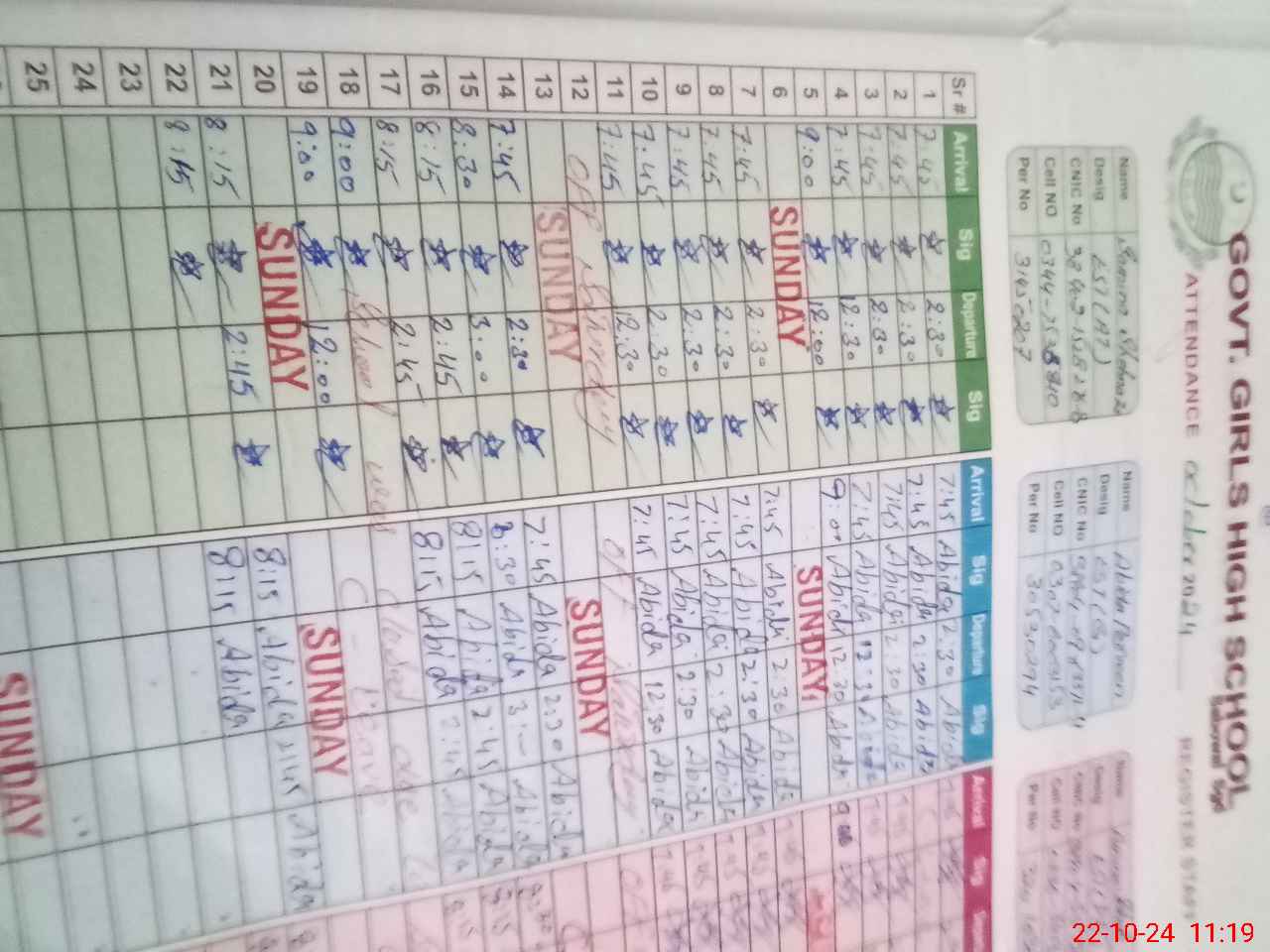 | CNIC | Full Name | Designation | R/C | Absence during last cal. month |