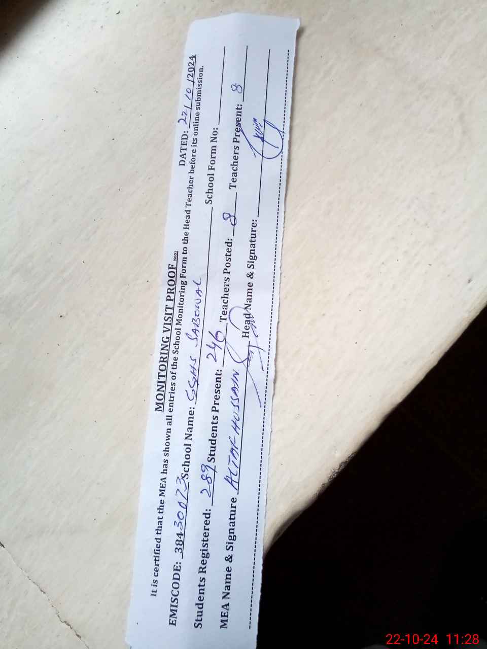 | Name: SA**** ZA**** Designation: (School Headmaster's/Headmistress's) SST Phone/Cell Number: 03**** |