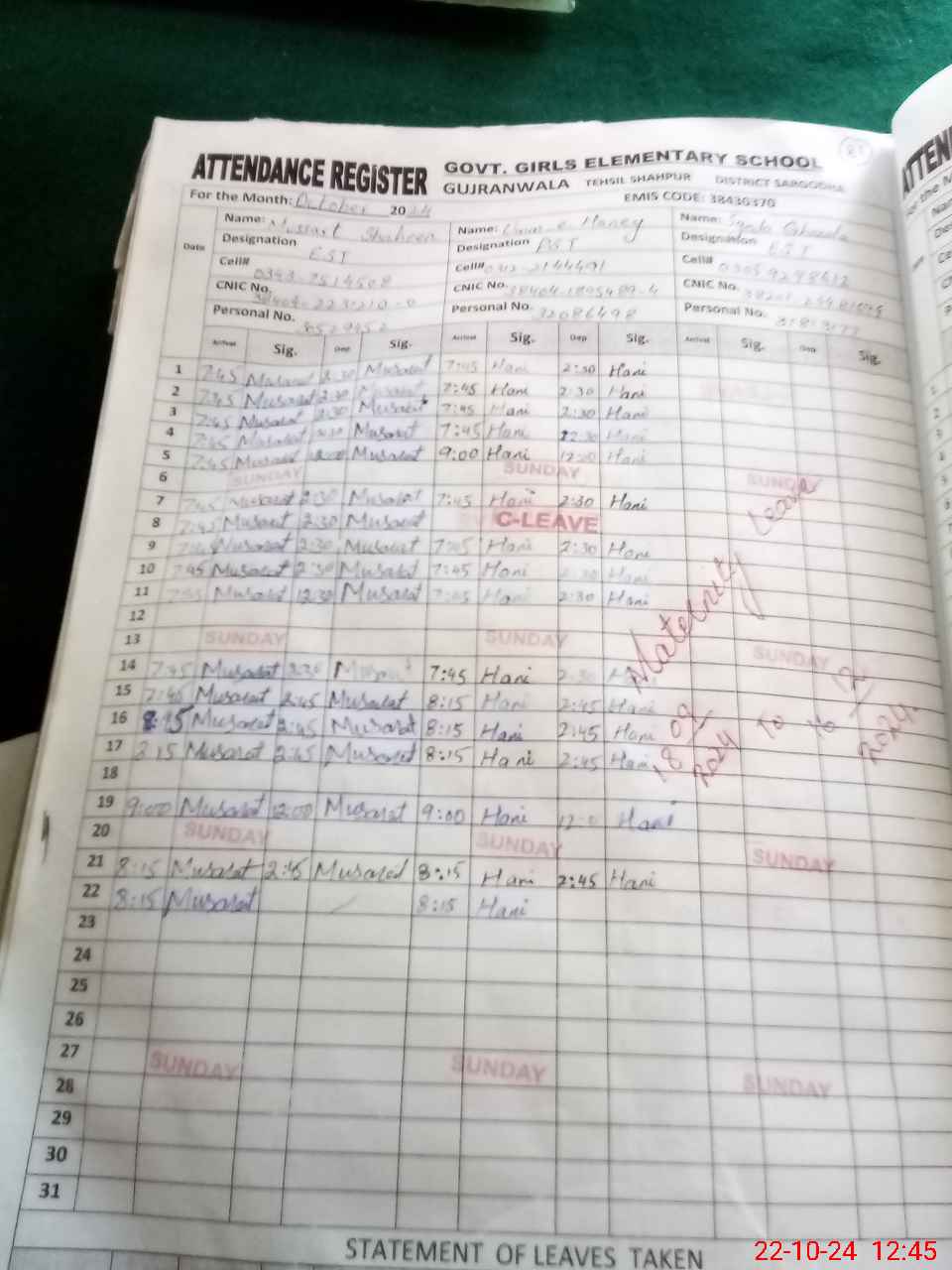 | CNIC | Full Name | Designation | R/C | Absence During Last Calender Month |