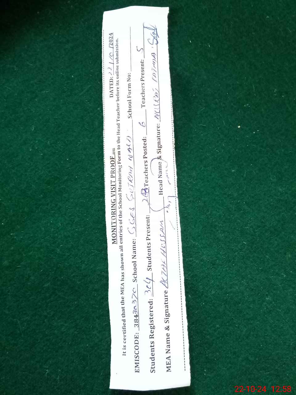 | Certified that this School was Inspected by the Undersigned MEA/DMO Today and the Information Stated Above is as Per Record. | |||||
