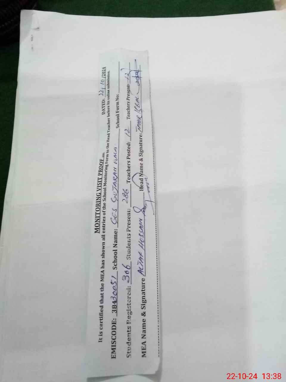 | Certified that this School was Inspected by the Undersigned MEA/DMO Today and the Information Stated Above is as Per Record. | |||||