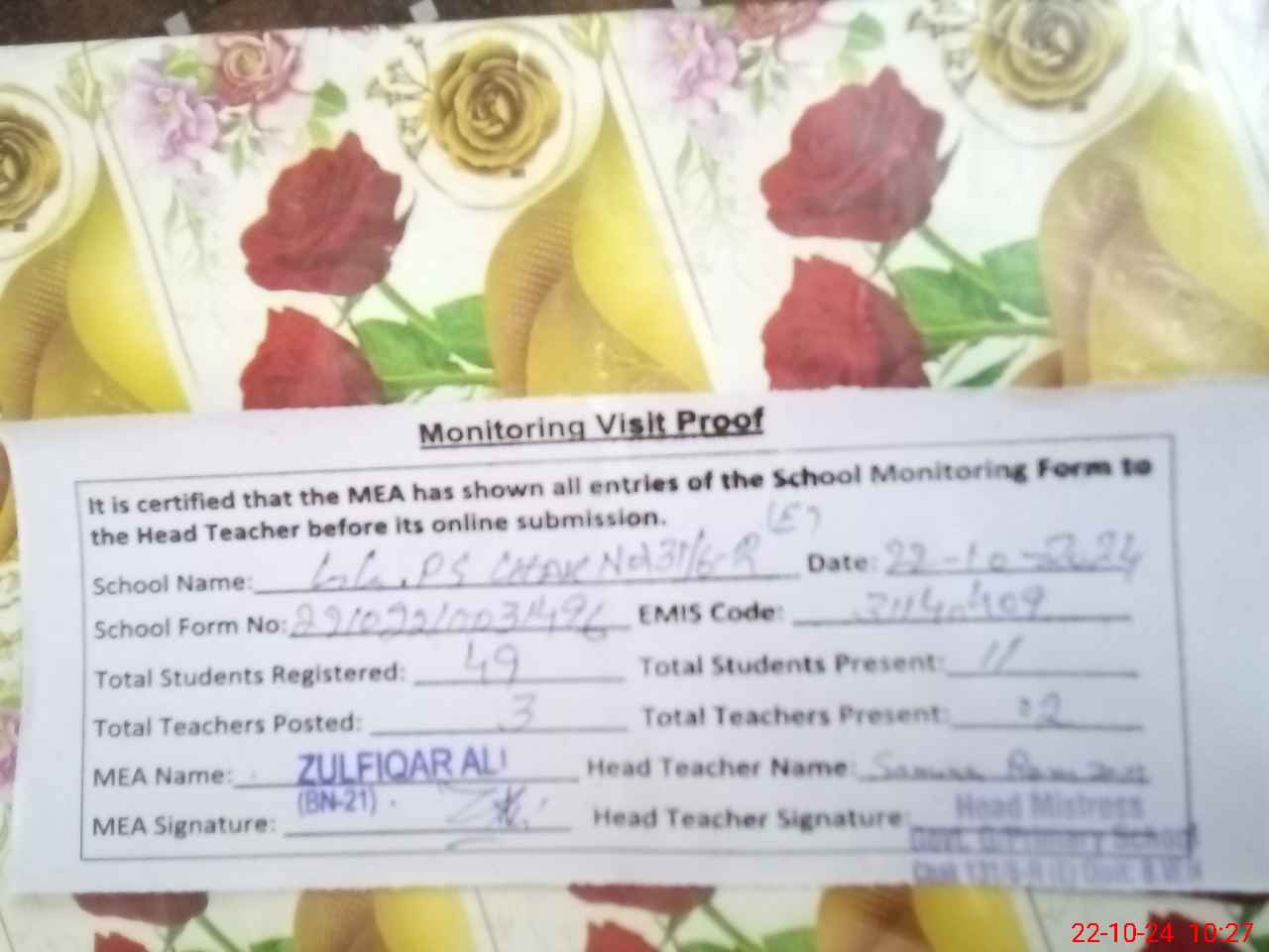 | Attendance Register | Head Teacher | MEA with School | Visit Proof |