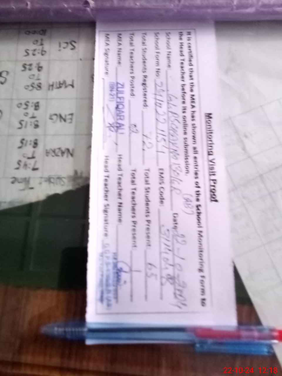 | Monitoring Date: 22-10-2024 | Start Time: 22-10-2024 11:42 AM | End Time: 22-10-2024 12:18 PM | Name of MEA: Zu**** Al**** BN**** | |