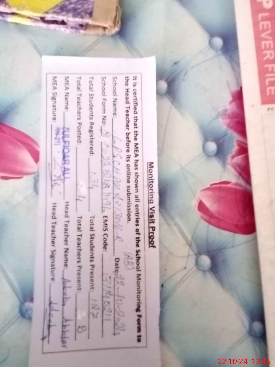 | Attendance Register | Head Teacher | MEA with School | Visit Proof |