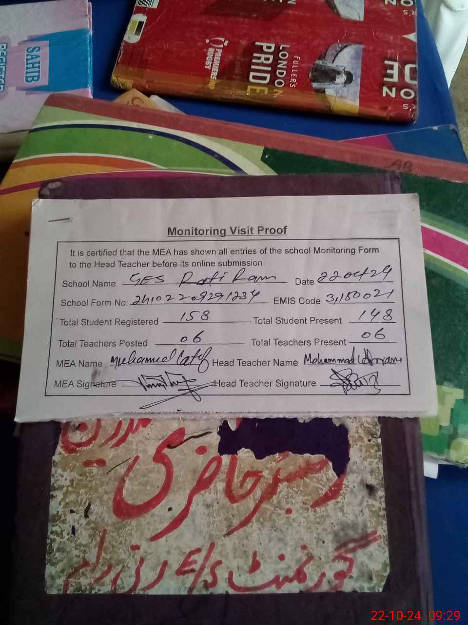 | Attendance Register | Head Teacher | MEA with School | Visit Proof |