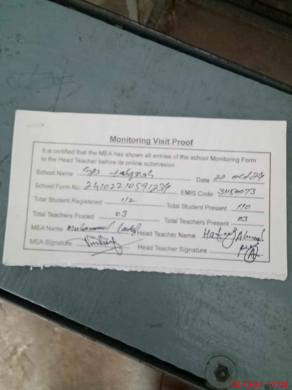 | Attendance Register | Head Teacher | MEA with School | Visit Proof |