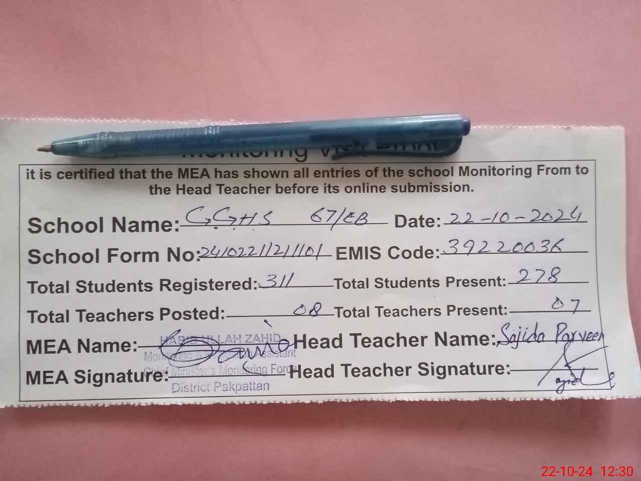 | EMIS Code: 39220036 | Name of School: GGHS 67 EB | |||