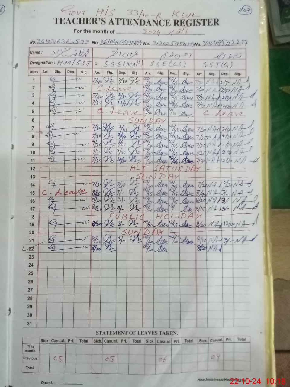 | CNIC | Full Name | Designation | R/C | Absence during last cal. month |