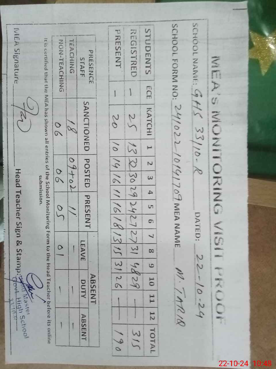 | Attendance Register | Head Teacher | MEA with School | Visit Proof |