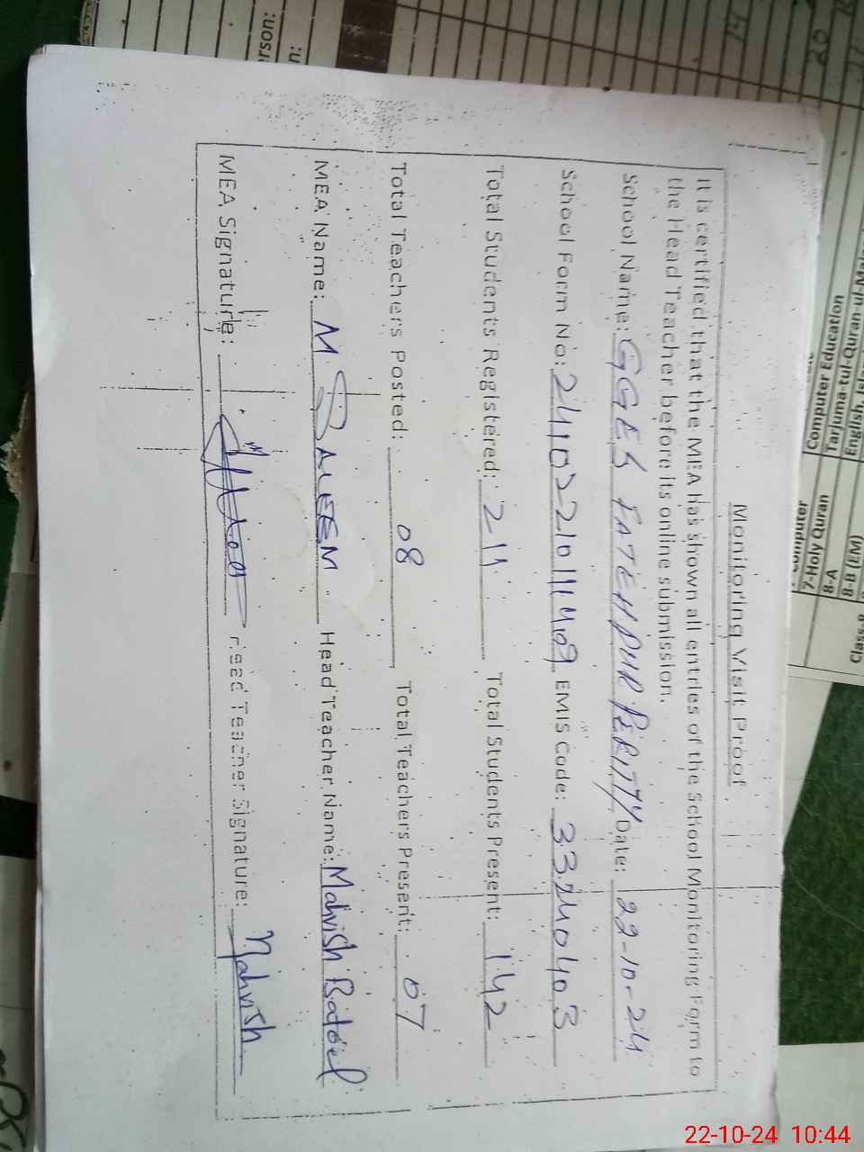 | Attendance Register | Head Teacher | MEA with School | Visit Proof |