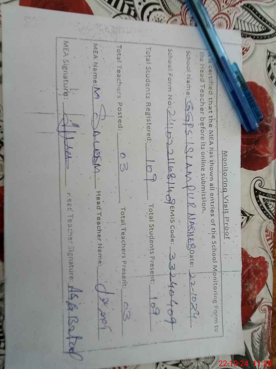| Name: AS**** BA**** Designation: (School Headmaster's/Headmistress's) PST Phone/Cell Number: 03**** |