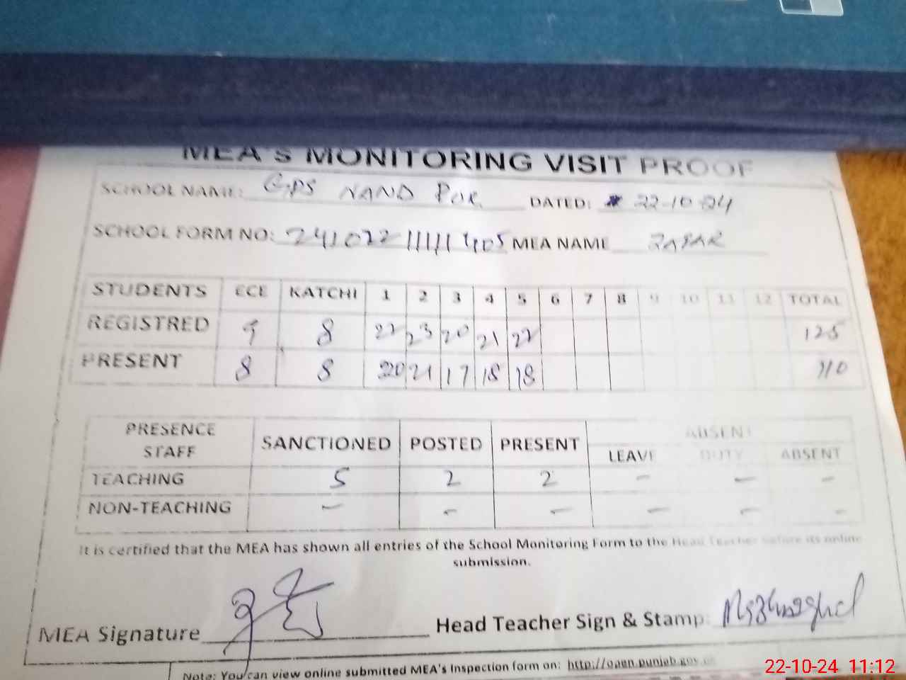 | Attendance Register | Head Teacher | MEA with School | Visit Proof |