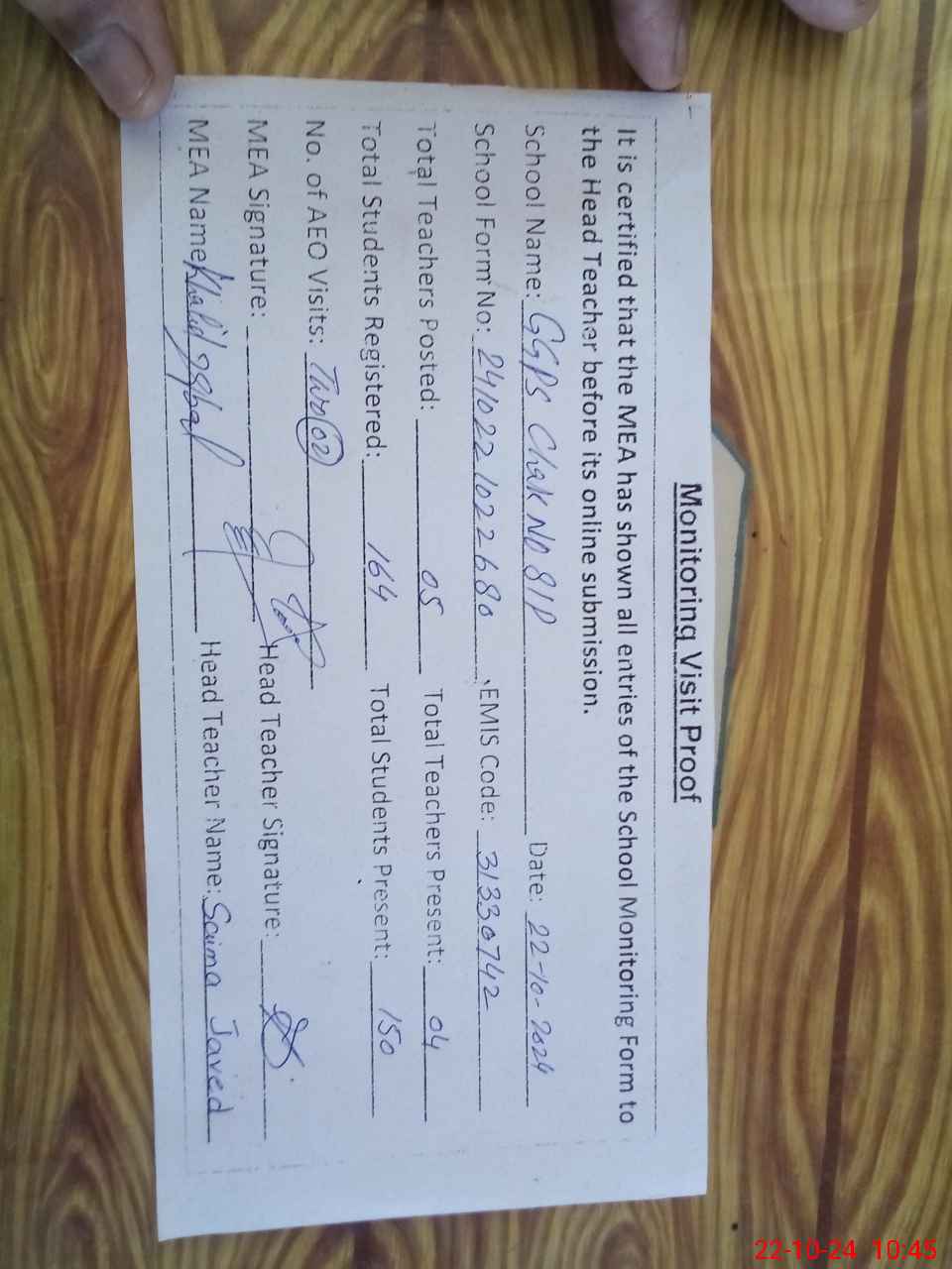 | Monitoring Date: 22-10-2024 | Start Time: 22-10-2024 10:22 AM | End Time: 22-10-2024 10:45 AM | Name of MEA: Kh**** Iq**** | |