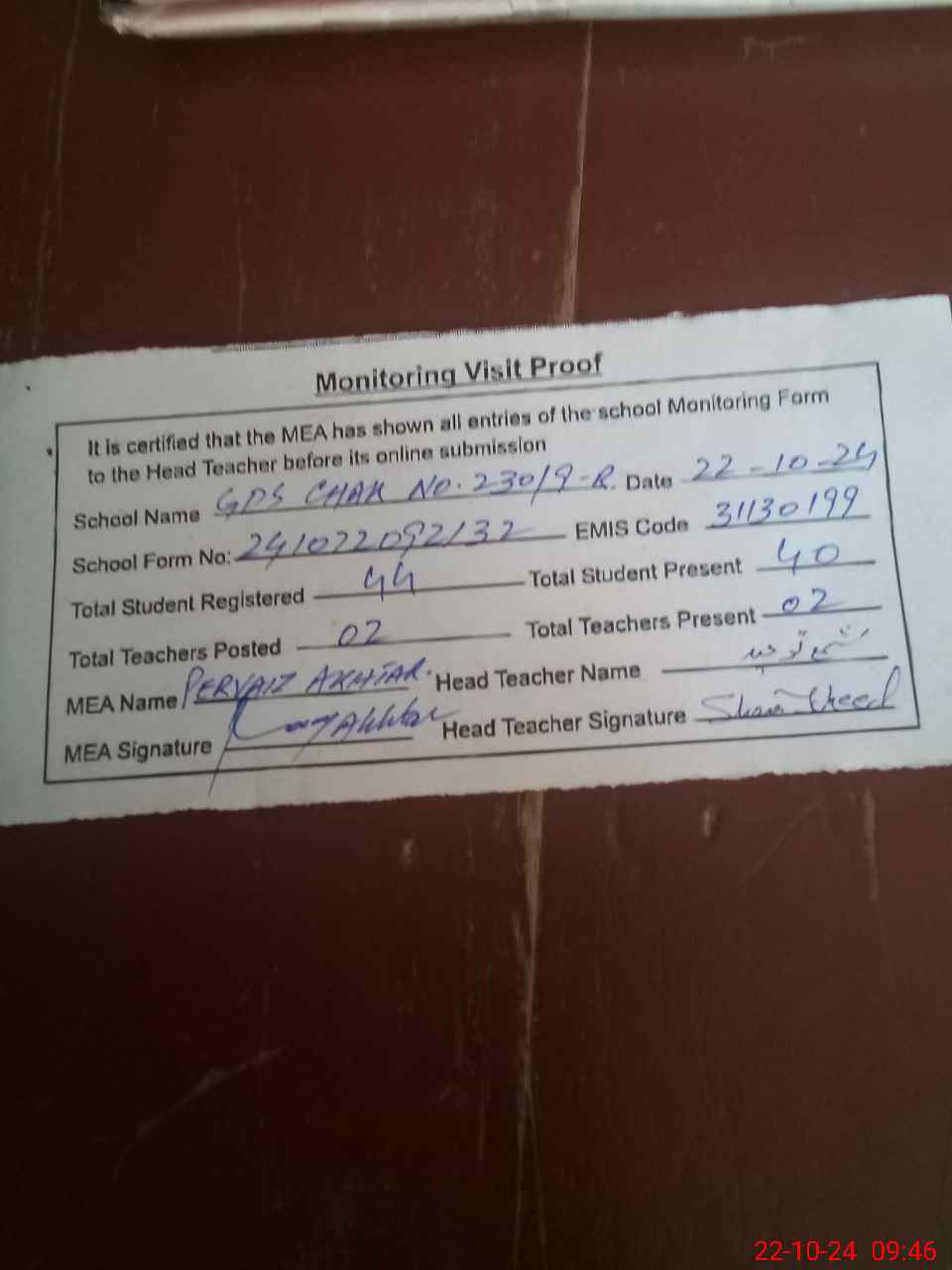 | Attendance Register | Head Teacher | MEA with School | Visit Proof |