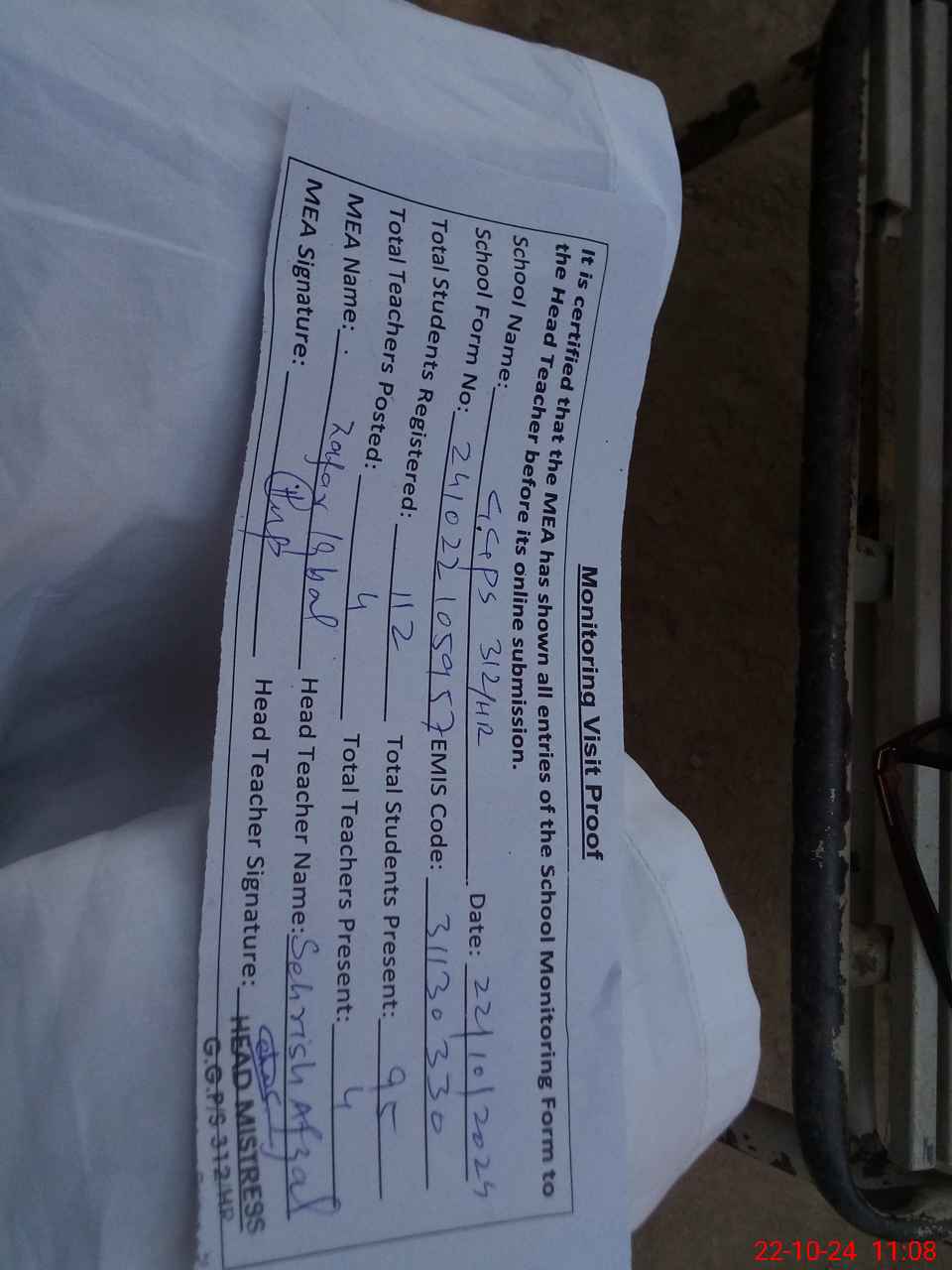 | Attendance Register | Head Teacher | MEA with School | Visit Proof |