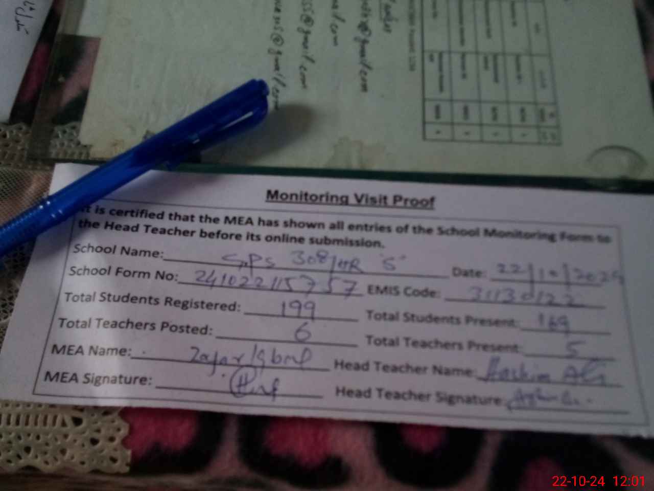 | Attendance Register | Head Teacher | MEA with School | Visit Proof |