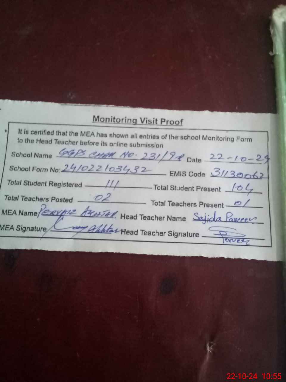 | Attendance Register | Head Teacher | MEA with School | Visit Proof |