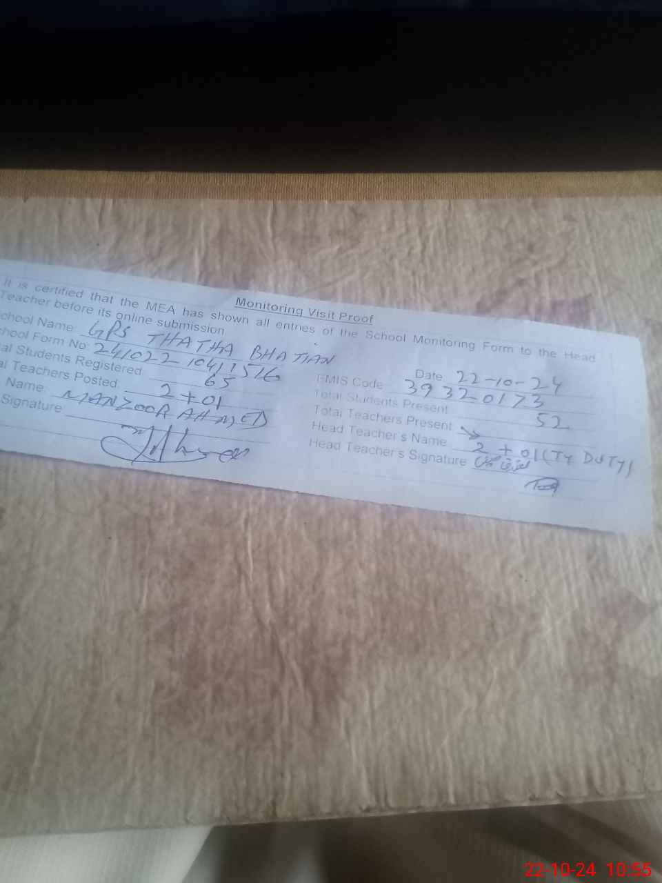 | Name: TA**** HU**** Designation: (School Headmaster's/Headmistress's) PTC/JV Phone/Cell Number: 03**** |