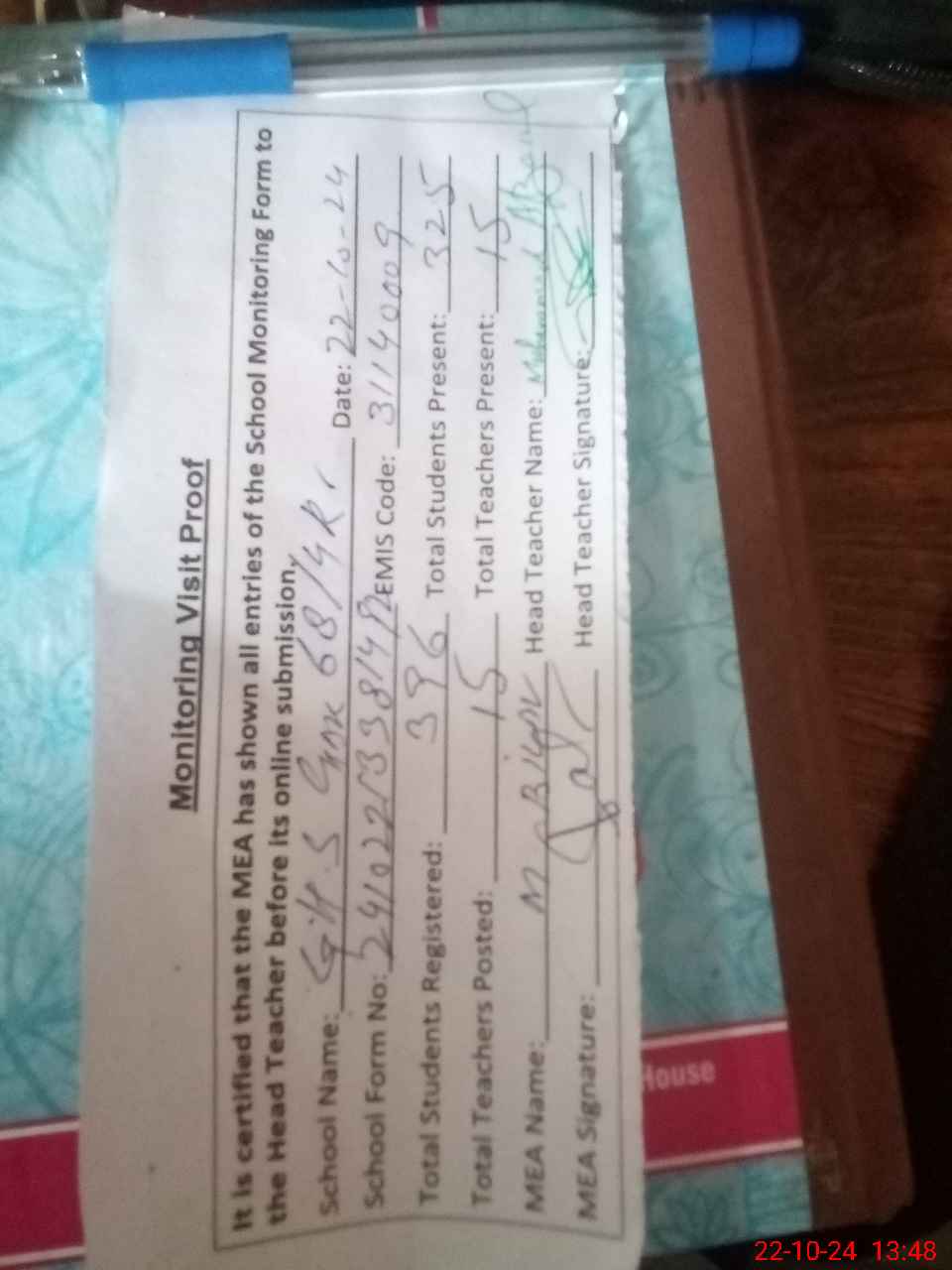 | Attendance Register | Head Teacher | MEA with School | Visit Proof |