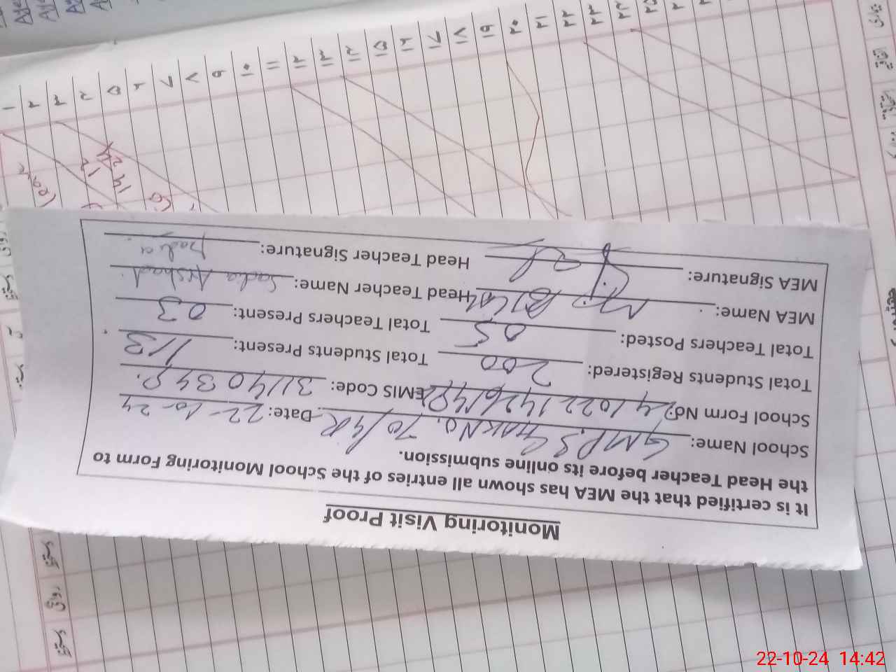 | Attendance Register | Head Teacher | MEA with School | Visit Proof |