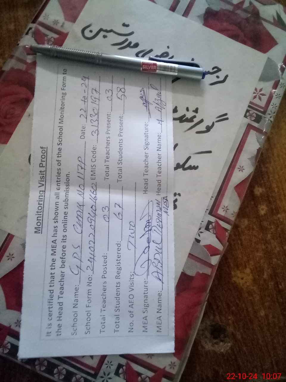 | Attendance Register | Head Teacher | MEA with School | Visit Proof |