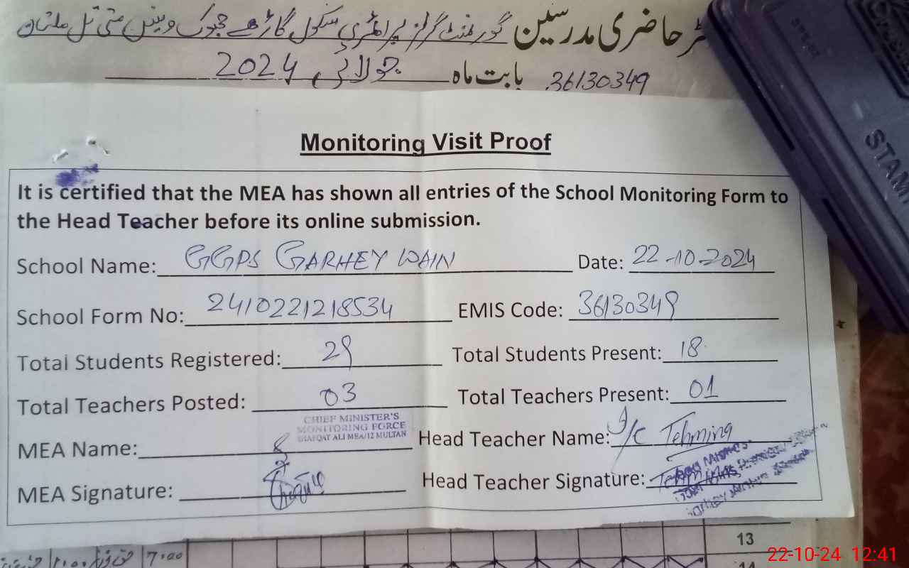 | EMIS Code: 36130349 | Name of School: GGPS GARHEY WAHIN JHOKE VAINCE | |||