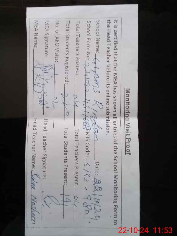 | Attendance Register | Head Teacher | MEA with School | Visit Proof |