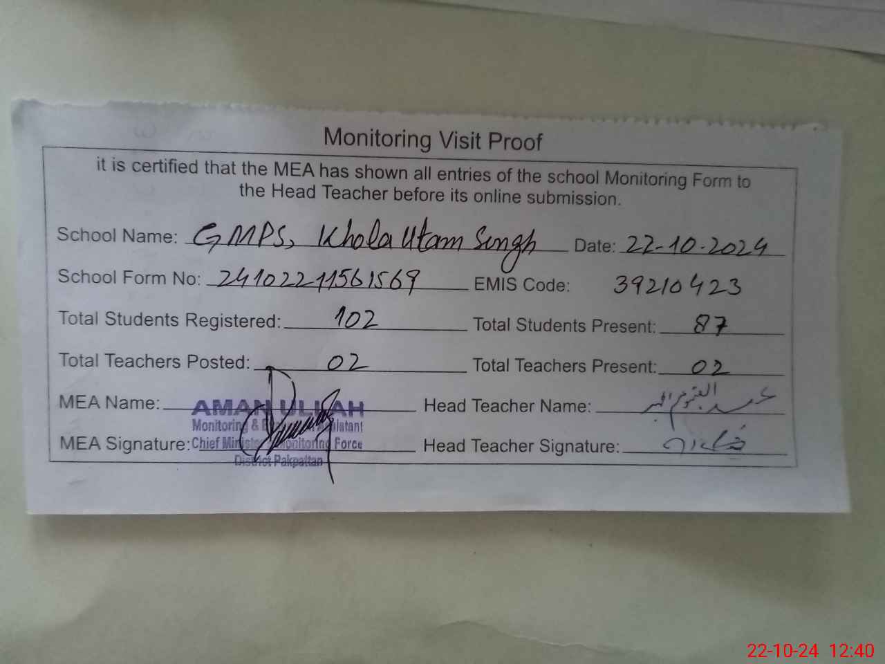 | EMIS Code: 39210423 | Name of School: GMPS KHOLA UTAM SINGH | |||