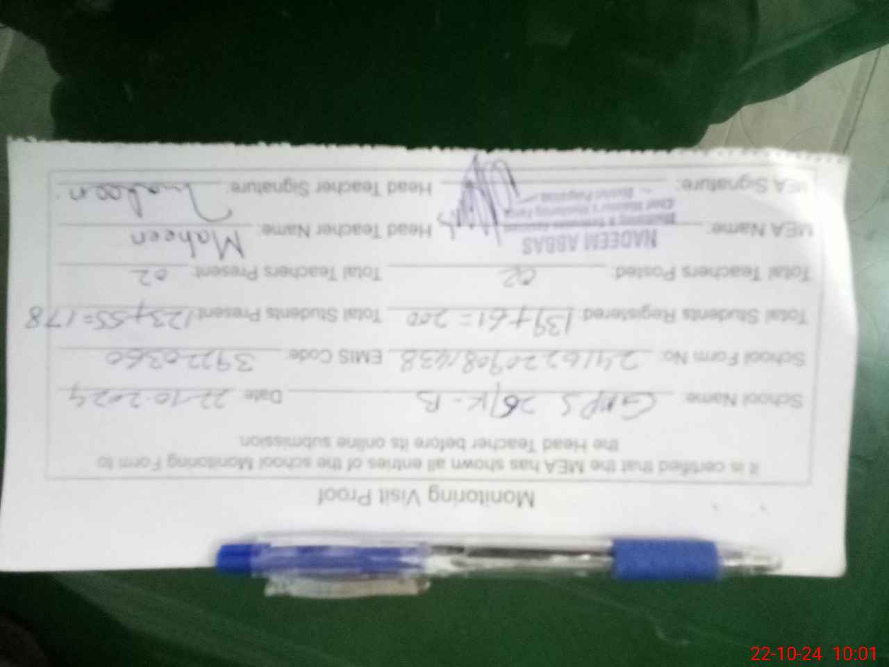 | Name: MA**** AK**** Designation: (School Headmaster's/Headmistress's) PST Phone/Cell Number: 03**** |