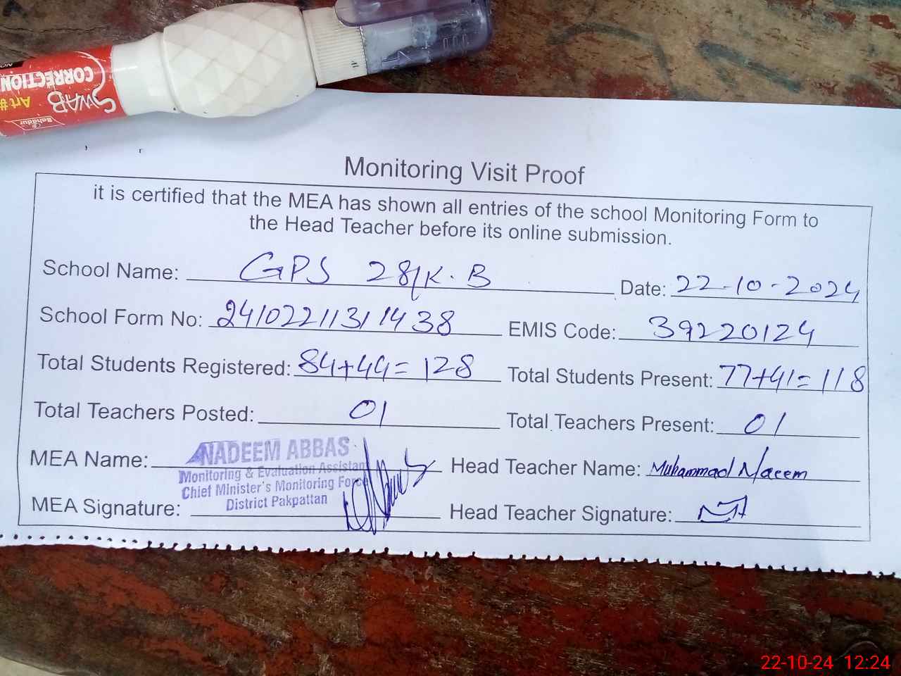 | EMIS Code: 39220124 | Name of School: GPS CHAK NO. 28 KB | |||