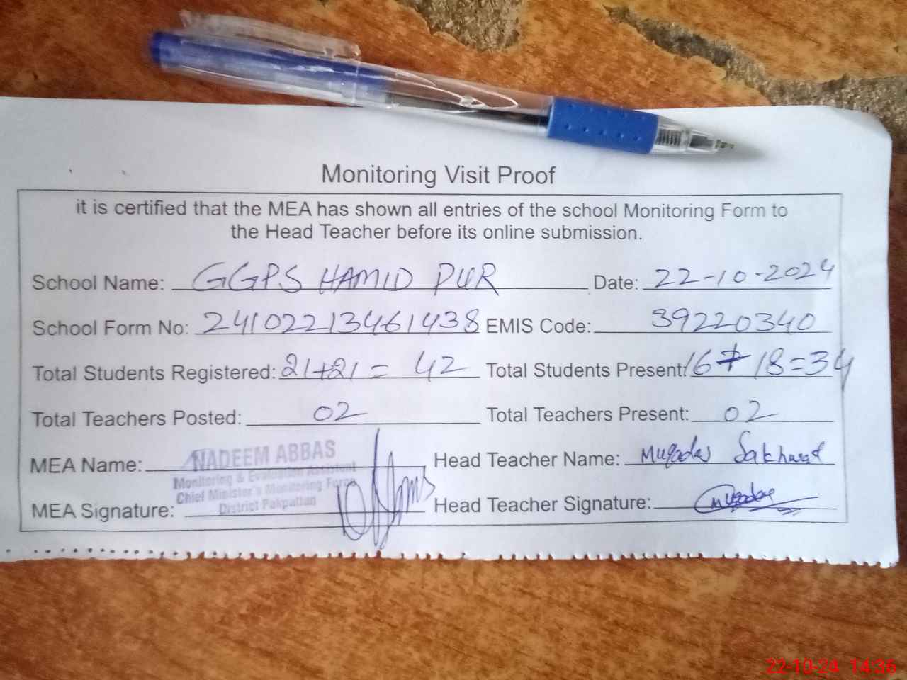 | Attendance Register | Head Teacher | MEA with School | Visit Proof |