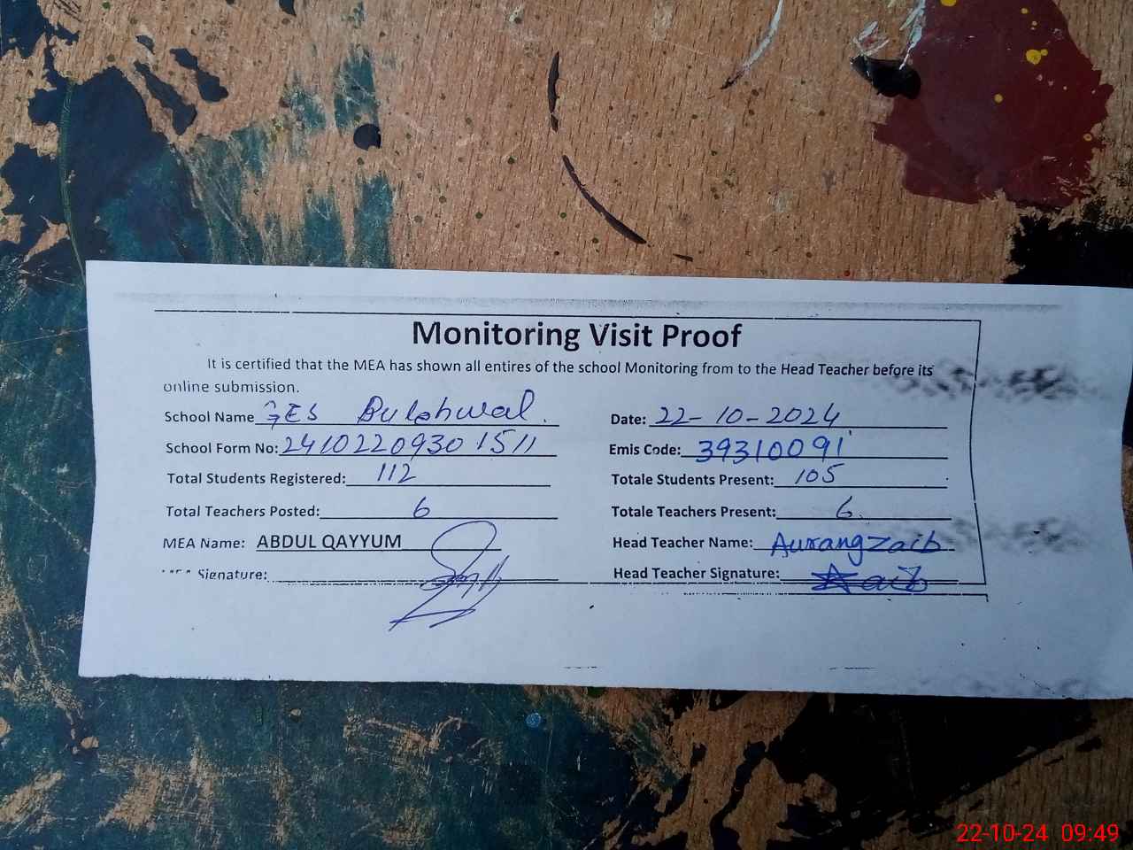 | Attendance Register | Head Teacher | MEA with School | Visit Proof |