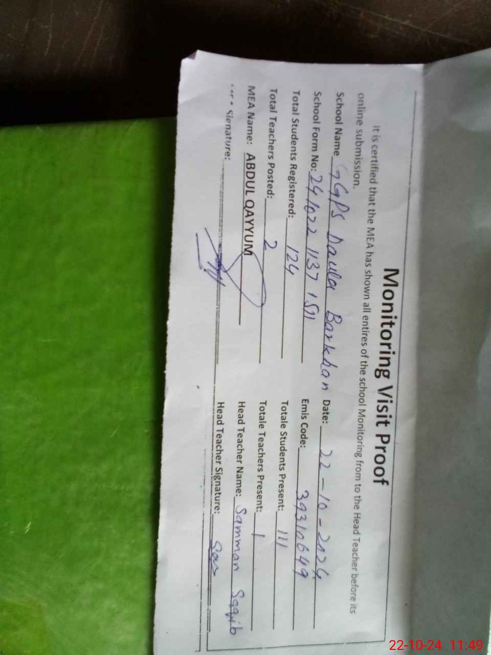 | Certified that this School was Inspected by the Undersigned MEA/DMO Today and the Information Stated Above is as Per Record. | |||||