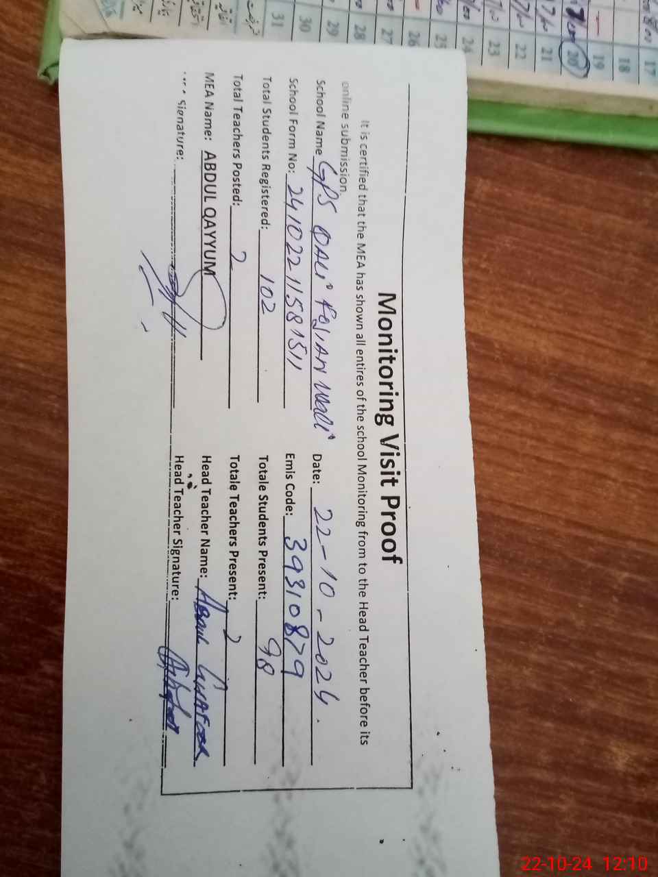 | Attendance Register | Head Teacher | MEA with School | Visit Proof |