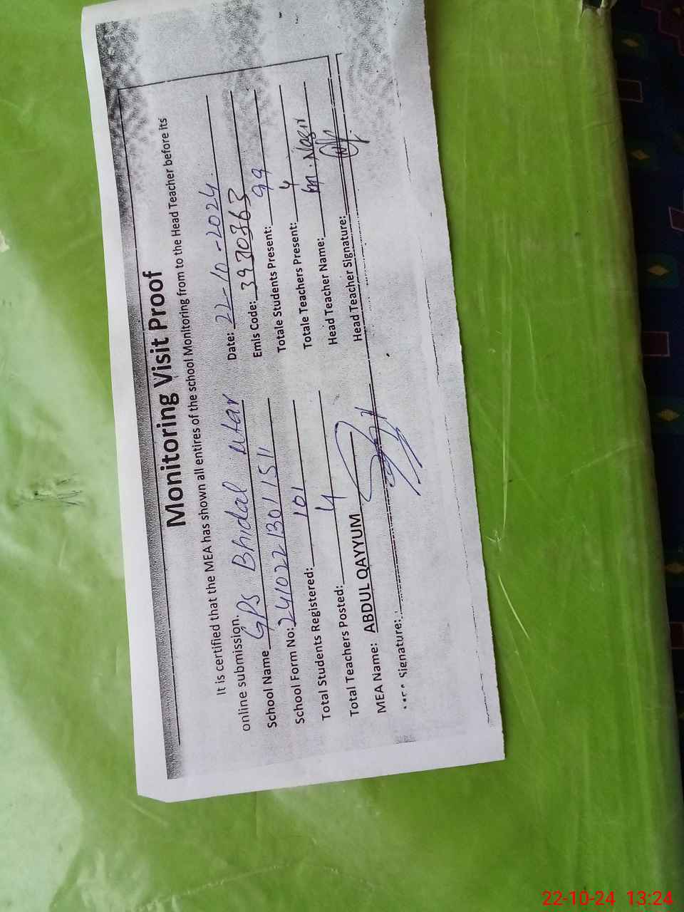 | Name: MU**** NA**** Designation: (School Headmaster's/Headmistress's) PST Phone/Cell Number: 03**** |