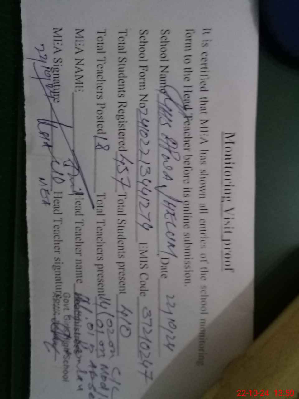 | Attendance Register | Head Teacher | MEA with School | Visit Proof |