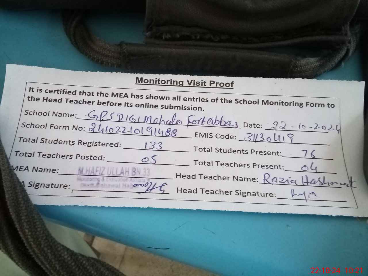 | EMIS Code: 31130419 | Name of School: GPS DIGI MOHALAH FORT ABBAS | |||